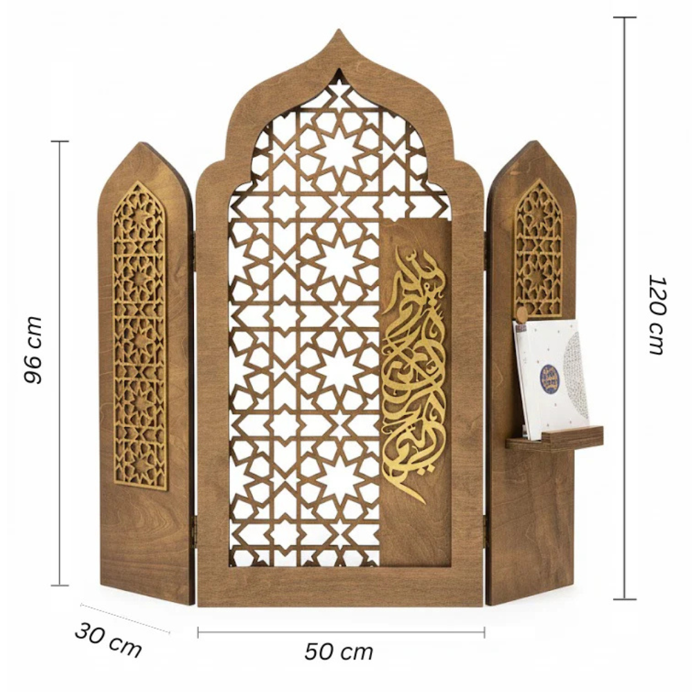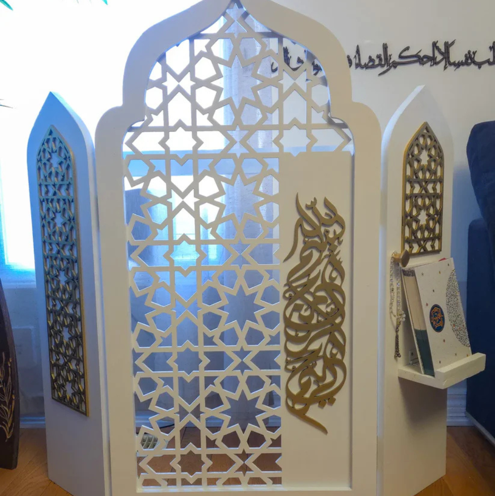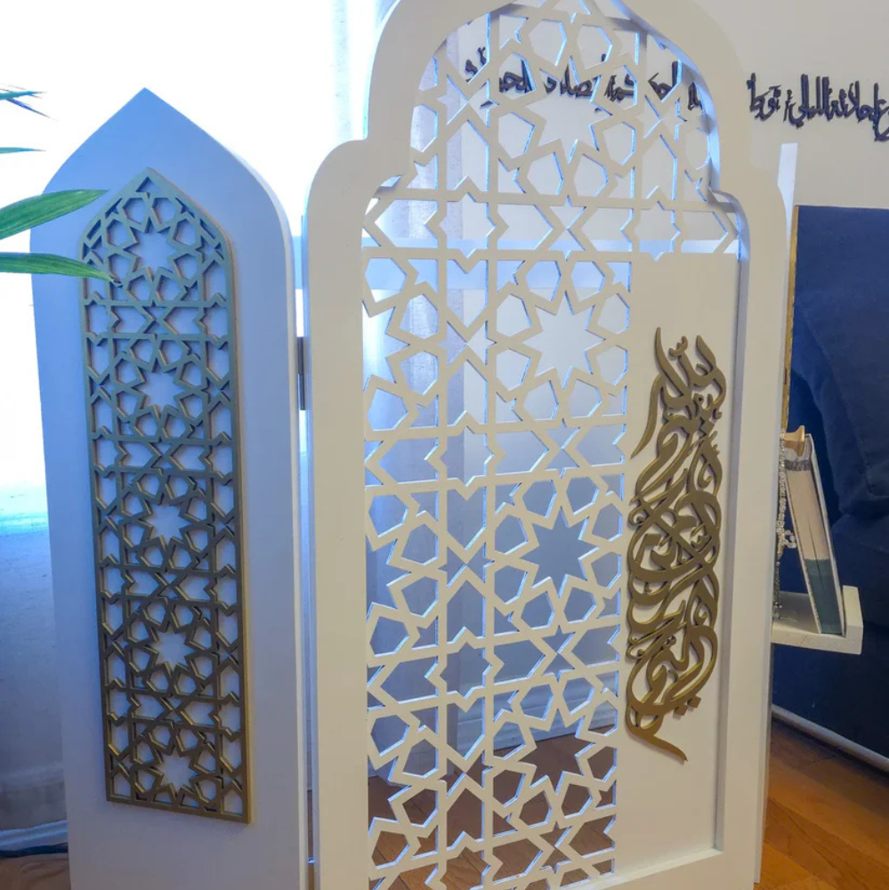 Mihrab El Noor transforme votre espace en un véritable lieu de recueillement, grâce à son design islamique élégant et ses motifs géométriques finement ajourés, pour une atmosphère calme et spirituelle.